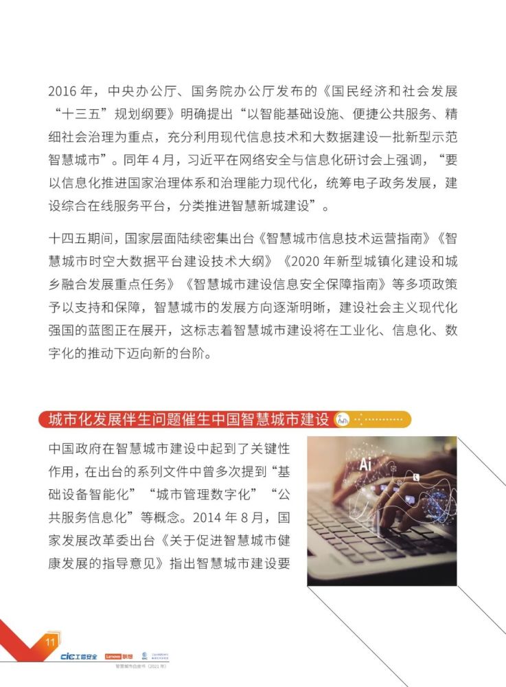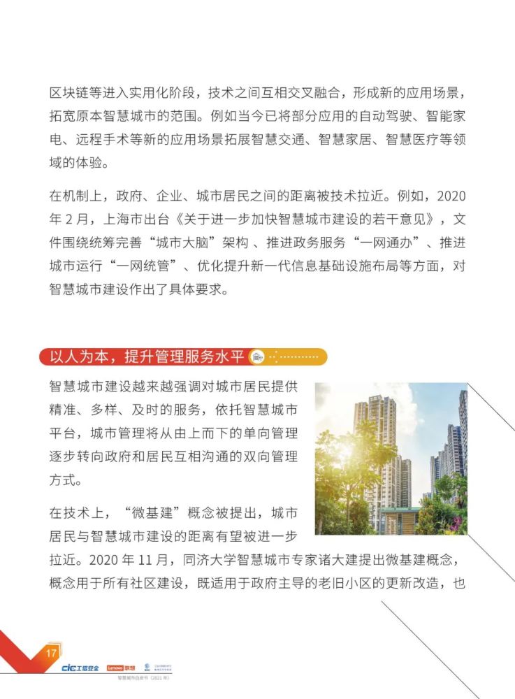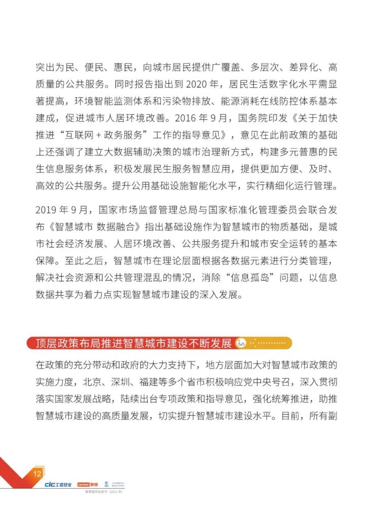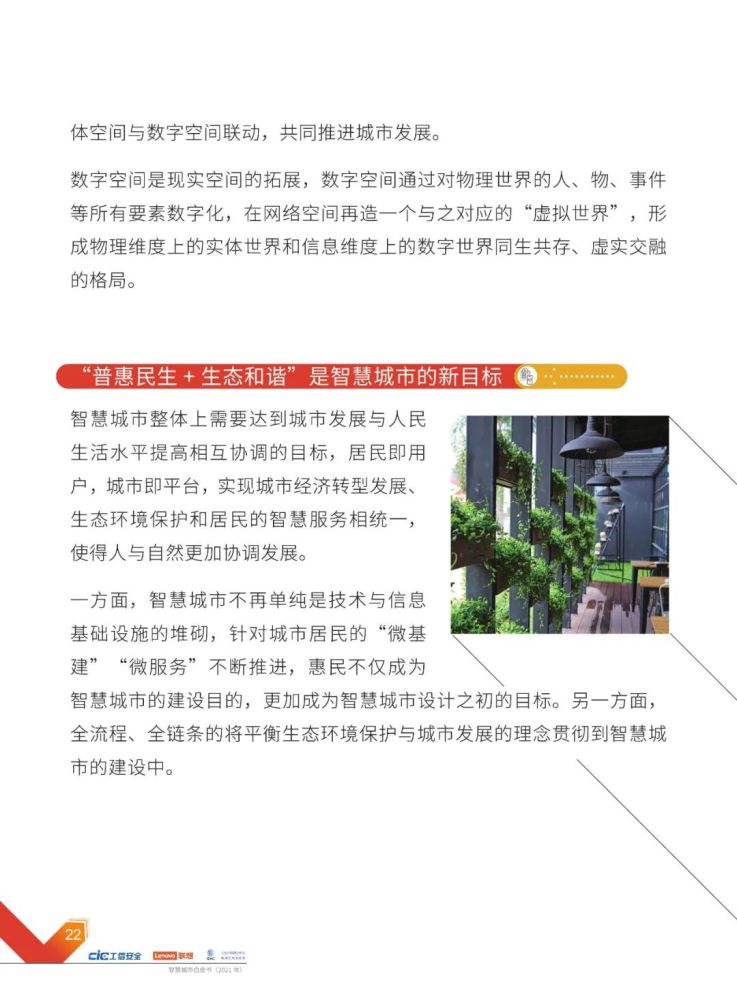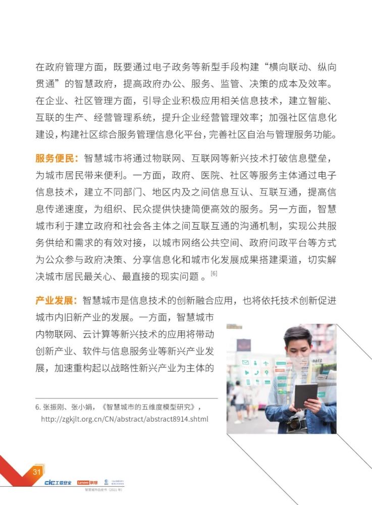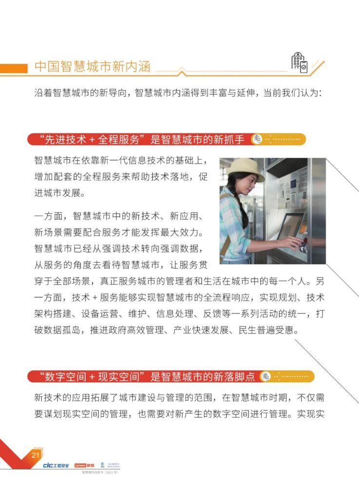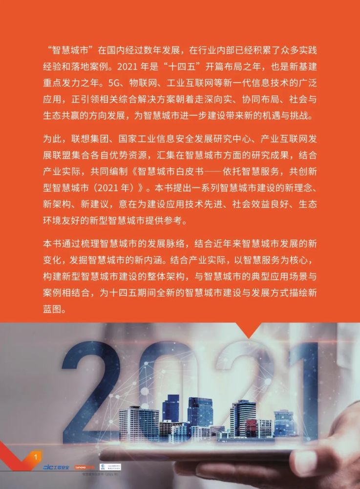 近日,由国家工业信息安全发展研究中心、联想集团、中国产业互联网发展联盟、工业大数据分析与集成应用实验室共同编制的《依托智慧服务,共创新型智慧城市——智慧城市白皮书(2021年)》(以下简称“白皮书”)正式发布。该白皮书采用案例分析、实证分析、调研分析等研究方法,深入剖析我国智慧城市发展历程与内在规律,针对智慧城市当前的发展情况,提出一系列智慧城市建设的新理念、新架构、新建议,旨在为建设应用技术先进、社会效益良好、生态环境友好的新型智慧城市提供参考。