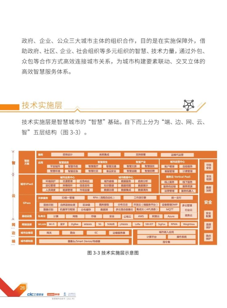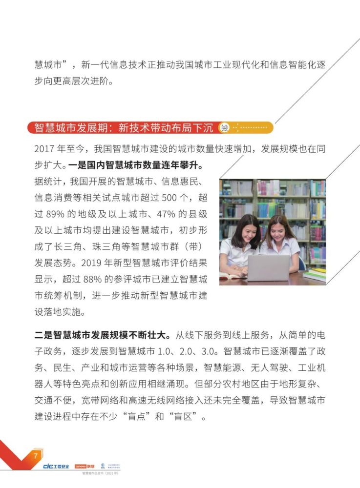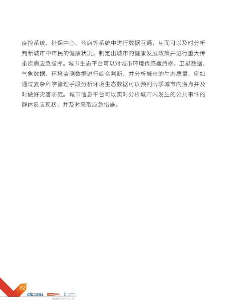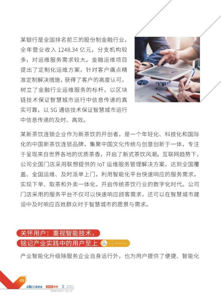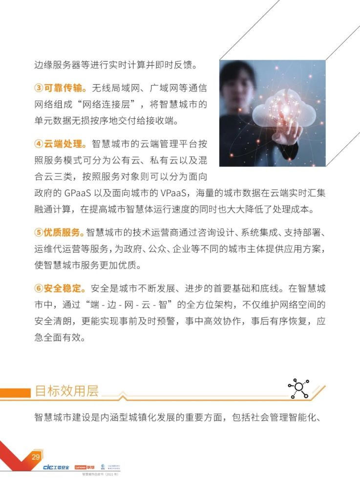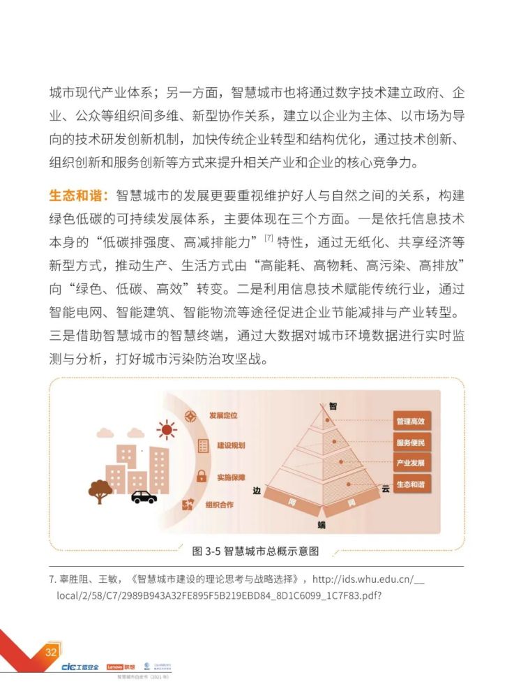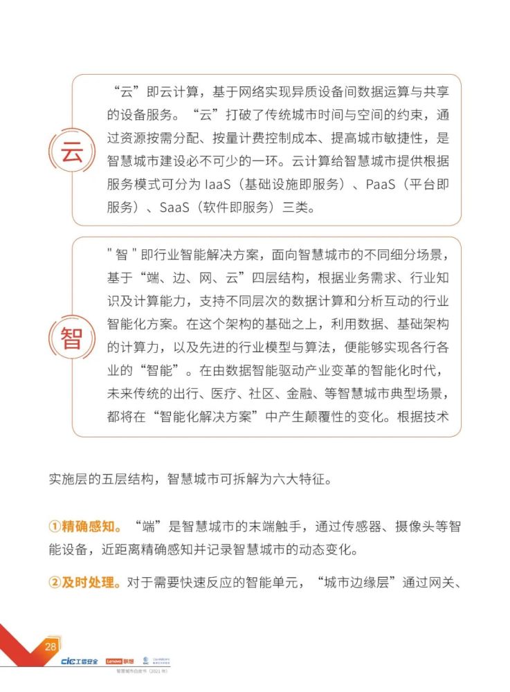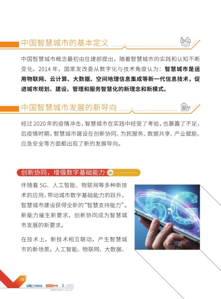 近日,由国家工业信息安全发展研究中心、联想集团、中国产业互联网发展联盟、工业大数据分析与集成应用实验室共同编制的《依托智慧服务,共创新型智慧城市——智慧城市白皮书(2021年)》(以下简称“白皮书”)正式发布。该白皮书采用案例分析、实证分析、调研分析等研究方法,深入剖析我国智慧城市发展历程与内在规律,针对智慧城市当前的发展情况,提出一系列智慧城市建设的新理念、新架构、新建议,旨在为建设应用技术先进、社会效益良好、生态环境友好的新型智慧城市提供参考。