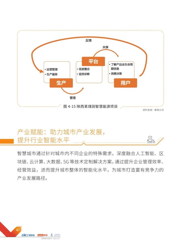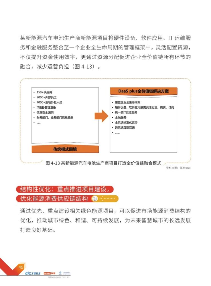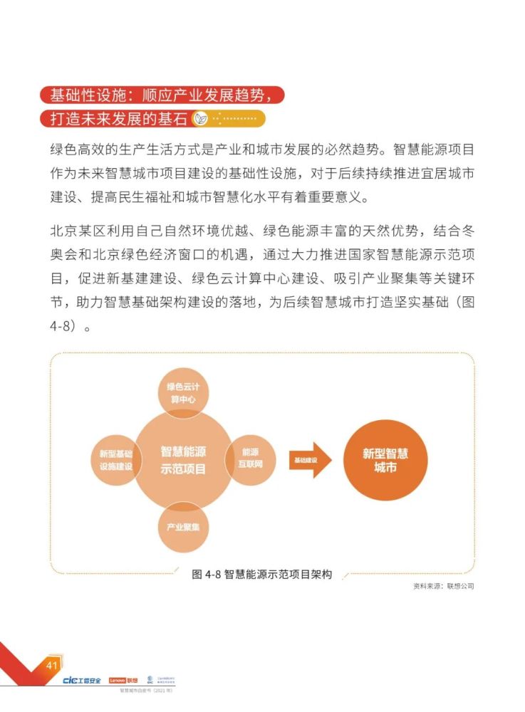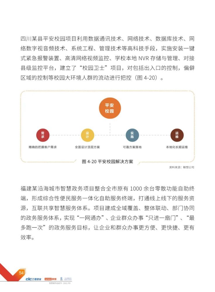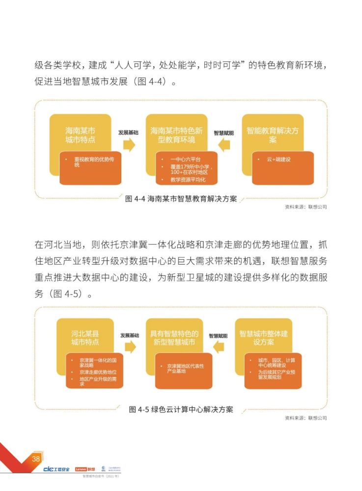 智慧城市建设是内涵型城镇化发展的重要方面,包括社会管理智能化、国民经济信息化、环境维护自动化和生活服务便捷化等内容。管理高效、服务便民、产业发展、生态和谐等均是新型智慧城市发展的目标方向。白皮书重点分析了文昌智能教育、延庆智慧能源、上海帝王蟹溯源等典型案例,展示了新型智慧城市在优政、兴业、惠民等方面取得的突出成效。据悉,联想凭借领先的IT运维服务经验和覆盖网络,智慧城市服务建设项目已在上海、江西、江苏、福建、湖北、海南、河北等全国多个省市落地,涉足绿色能源、社会治安管理、城市应急管理、智慧教育、智慧交通、食品安全以及智慧政务等多个细分场景。在白皮书编制过程中,联想为智慧城市建设运营实践和案例调研提供了支持。