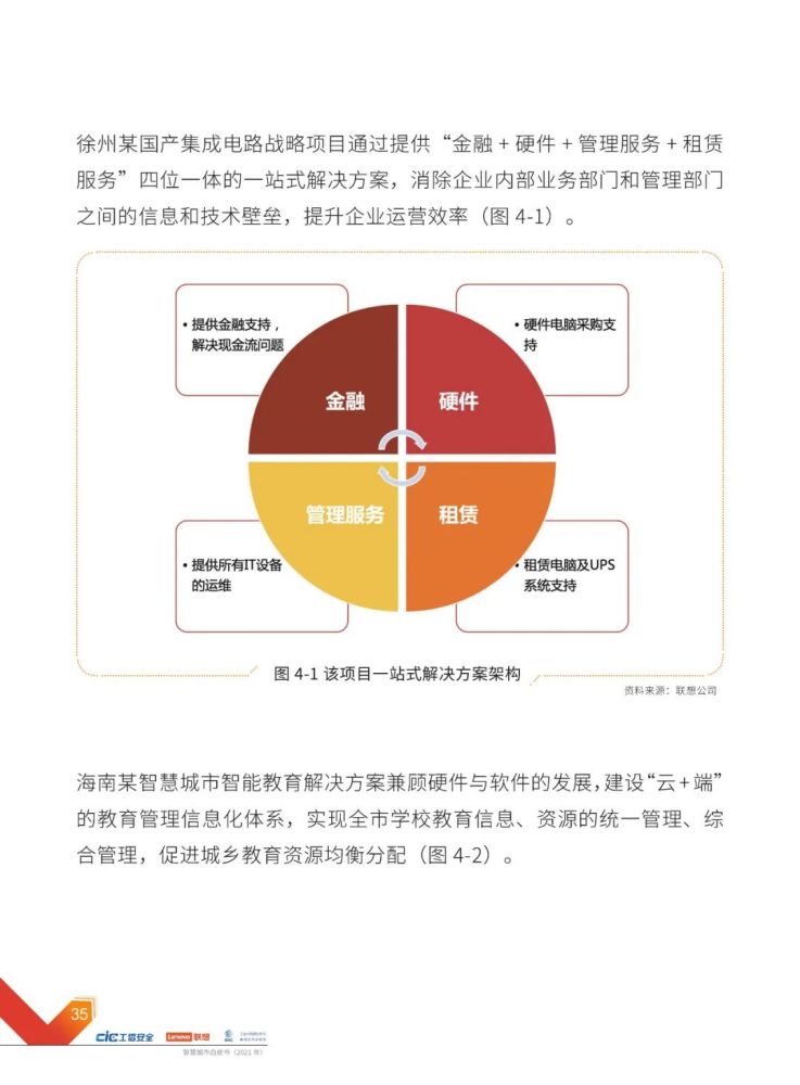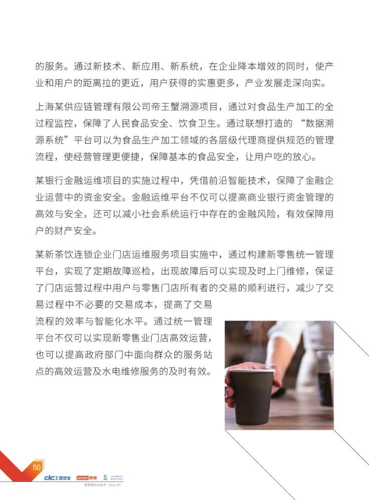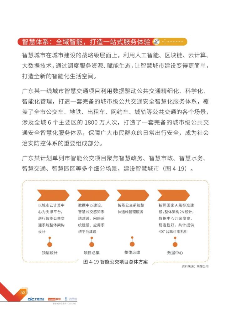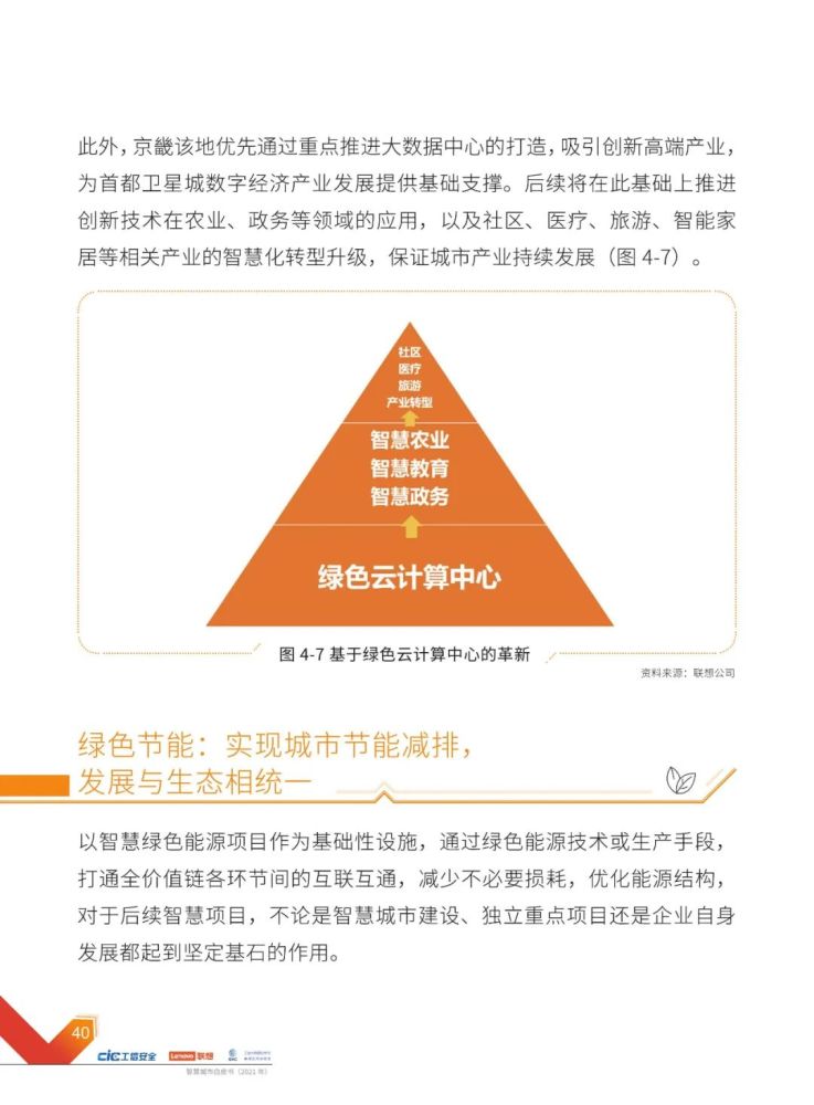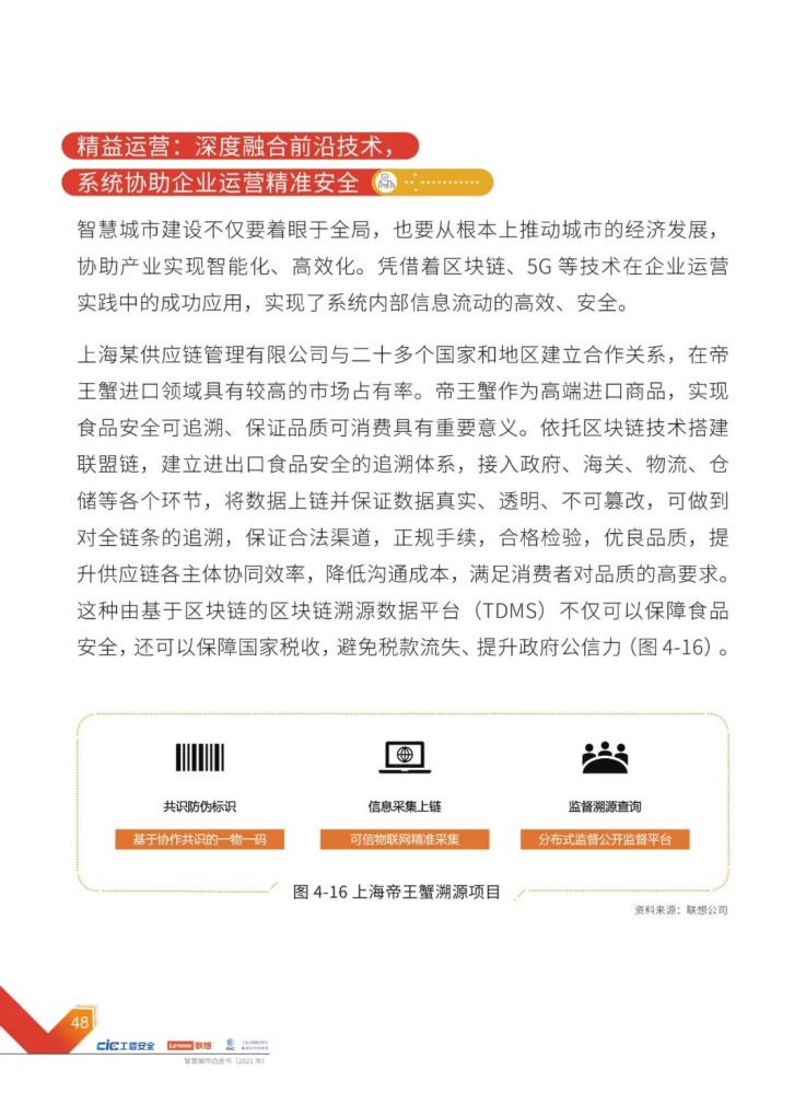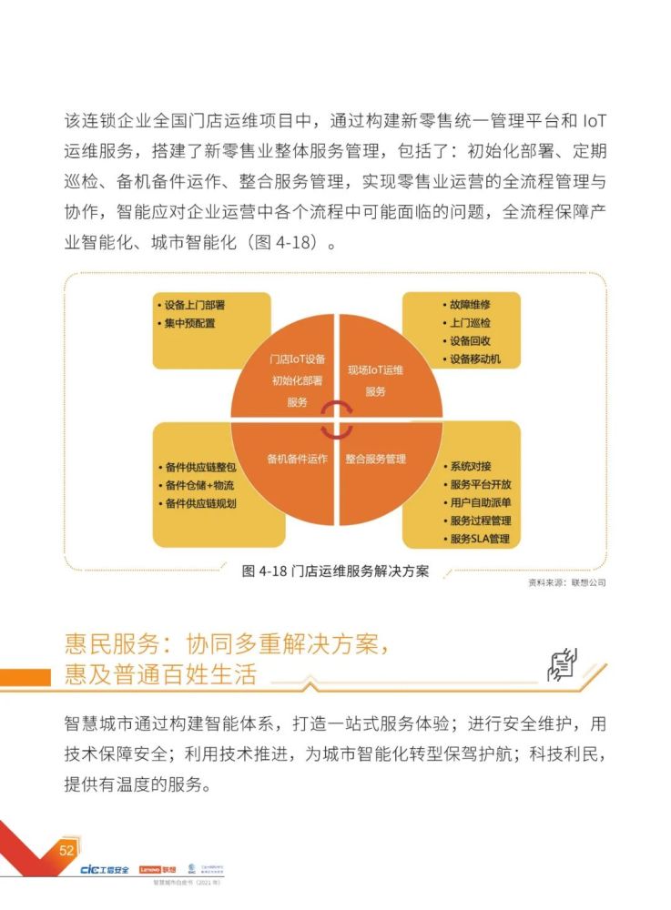 智慧城市建设是内涵型城镇化发展的重要方面,包括社会管理智能化、国民经济信息化、环境维护自动化和生活服务便捷化等内容。管理高效、服务便民、产业发展、生态和谐等均是新型智慧城市发展的目标方向。白皮书重点分析了文昌智能教育、延庆智慧能源、上海帝王蟹溯源等典型案例,展示了新型智慧城市在优政、兴业、惠民等方面取得的突出成效。据悉,联想凭借领先的IT运维服务经验和覆盖网络,智慧城市服务建设项目已在上海、江西、江苏、福建、湖北、海南、河北等全国多个省市落地,涉足绿色能源、社会治安管理、城市应急管理、智慧教育、智慧交通、食品安全以及智慧政务等多个细分场景。在白皮书编制过程中,联想为智慧城市建设运营实践和案例调研提供了支持。