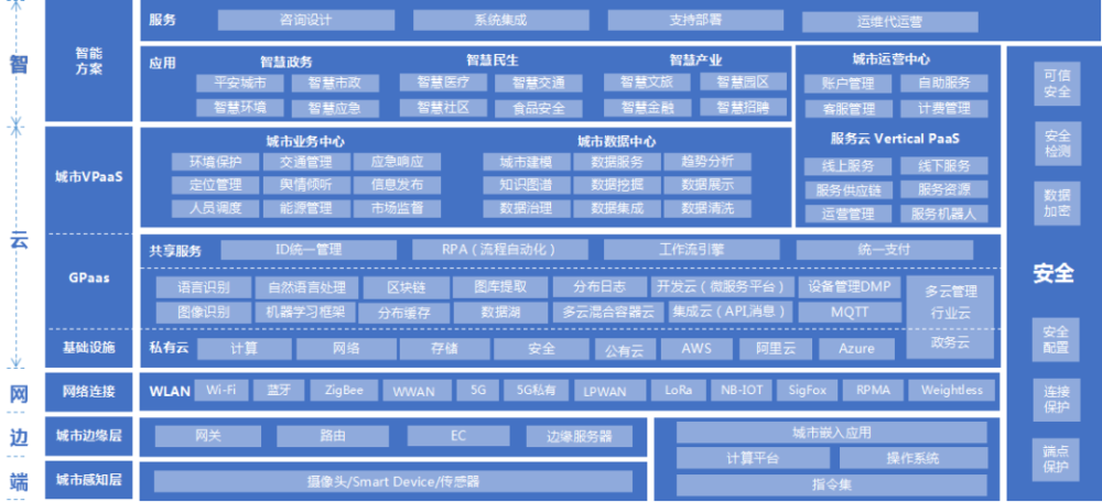 其中,“端-边-网-云-智”作为新型智慧城市的技术实施层,蕴含巨大的创新发展空间,有望成为我国智慧城市技术应用方向的重要创新成果。“端”即智能终端,负责采集、存储、传递数据,是智慧城市面向城市主体的智能化单元。“边”即边缘计算,智能化时代海量数据的爆发式计算需求与应用低时延、灵活部署要求使得计算力下沉成为必然,边缘计算应运而生。“网”即以5G为代表的数据传输的网络,是推动端、边、云协同工作的粘合剂。“云”即云计算,基于网络实现异质设备间数据运算与共享的设备服务。“智”即行业智能解决方案,面向智慧城市的不同细分场景,基于“端、边、网、云”四层结构,根据业务需求、行业知识及计算能力,支持不同层次的数据计算和分析互动的行业智能化方案。